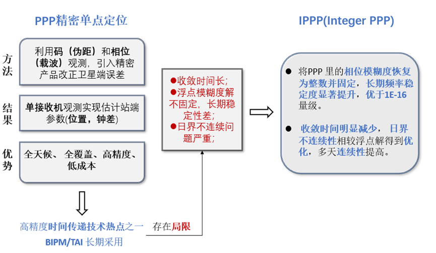 传统 PPP 方法存在哪些局限性?IPPP 相较于 PPP 具备何种技术优势?IPPP(Integer Precise Point Positioning)即整周模糊度固定的 PPP,又称 PPP-AR(Precise Point Positioning with Integer Ambiguity Resolution),其并非另起炉灶的全新技术体系,而是在 PPP 基础上,充分挖掘并利用了原本未被充分开发的高精度观测信息,其相较于 PPP 的主要优势如图 1 所示。载波相位观测值与伪距码存在本质差异,前者测量噪声更小,可支撑短期和长期频率稳定度的提升;但需注意,若模糊度无法保持或恢复整数特性,在批处理边界、信号失锁、初始化过程或精密产品不连续等场景下,易导致时频传递链路不连续,且长期稳定度出现劣化。