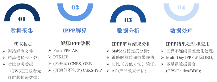 在 GNSS 时频传递研究领域中,PPP是很多实验室的主力方法。它是把卫星信号里的码观测、载波相位,再加上高精度轨道和钟产品,一起放进模型里解算,最后得到本地钟和参考时间之间的关系。PPP的工作方式为每个站分别利用卫星观测值,估计接收机钟相对于所采用产品参考时间尺度的偏差;再把两个站的结果相减,得到站间钟差。过去十多年,PPP一直是高精度 GNSS 时间与频率传递的重要路线,原因也很直接:它不需要像传统差分方法那样依赖近距离参考站,适合做跨区域的远程比对。